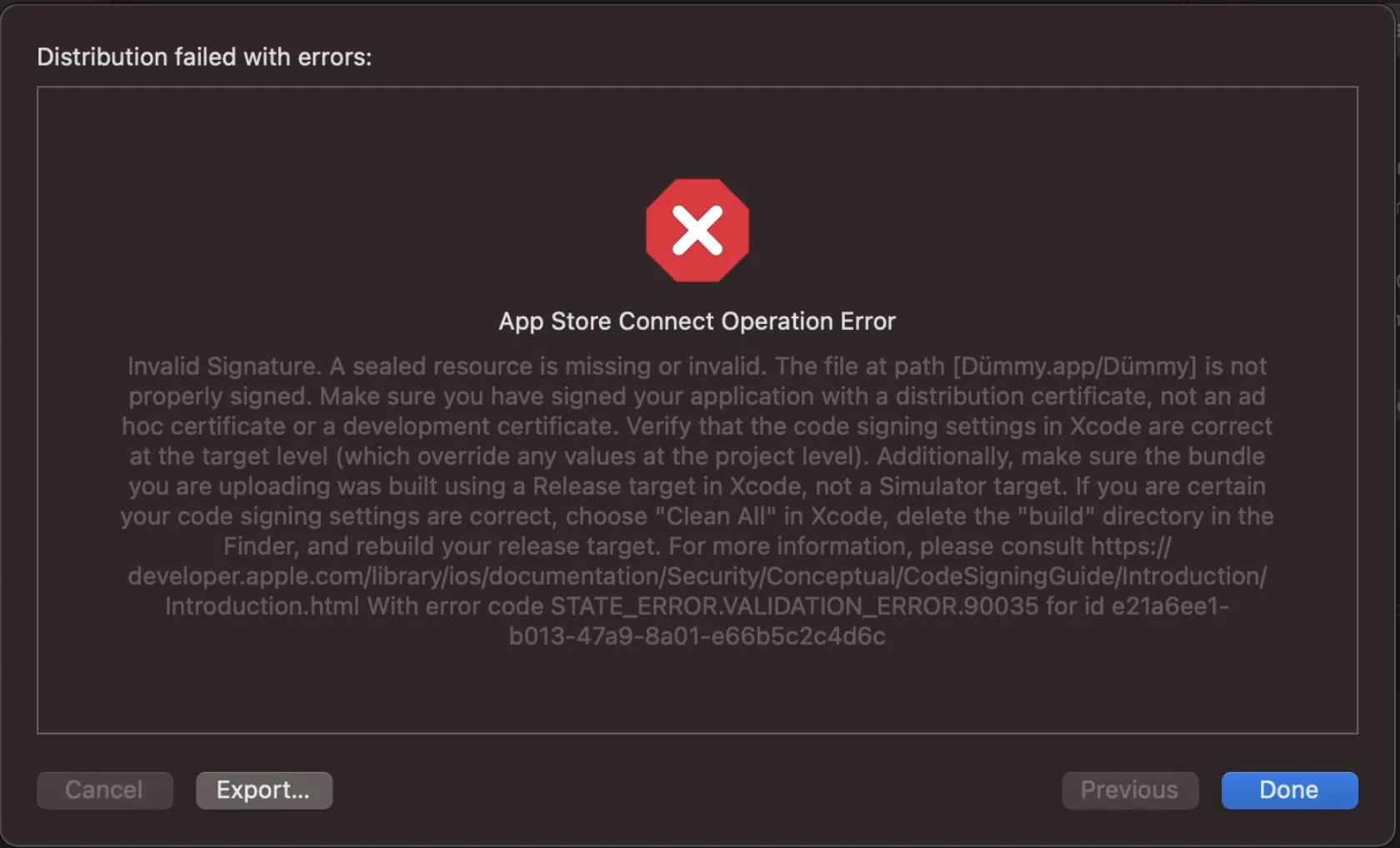 ![ERROR ITMS-90035: "Invalid Signature. A sealed resource is missing or invalid. The file at path [Dümmy.app/Dümmy] is not properly signed. Make sure you have signed your application with a distribution certificate, not an ad hoc certificate or a development certificate. Verify that the code signing settings in Xcode are correct at the target level (which override any values at the project level).](/img/posts/special-characters-ios-error.webp)